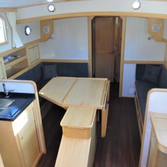 Es ist fast genauso groß wie der bekannte Wanderer 37-Staal, aber leichter und wendiger und hat eine ähnliche Aufteilung und Segelausrüstung: ein klassisch geschnittenes Midschwert-Segelboot mit Kuttertakelage mit Stagsegel, durchgestecktem Ruder und geschütztem Cockpit.